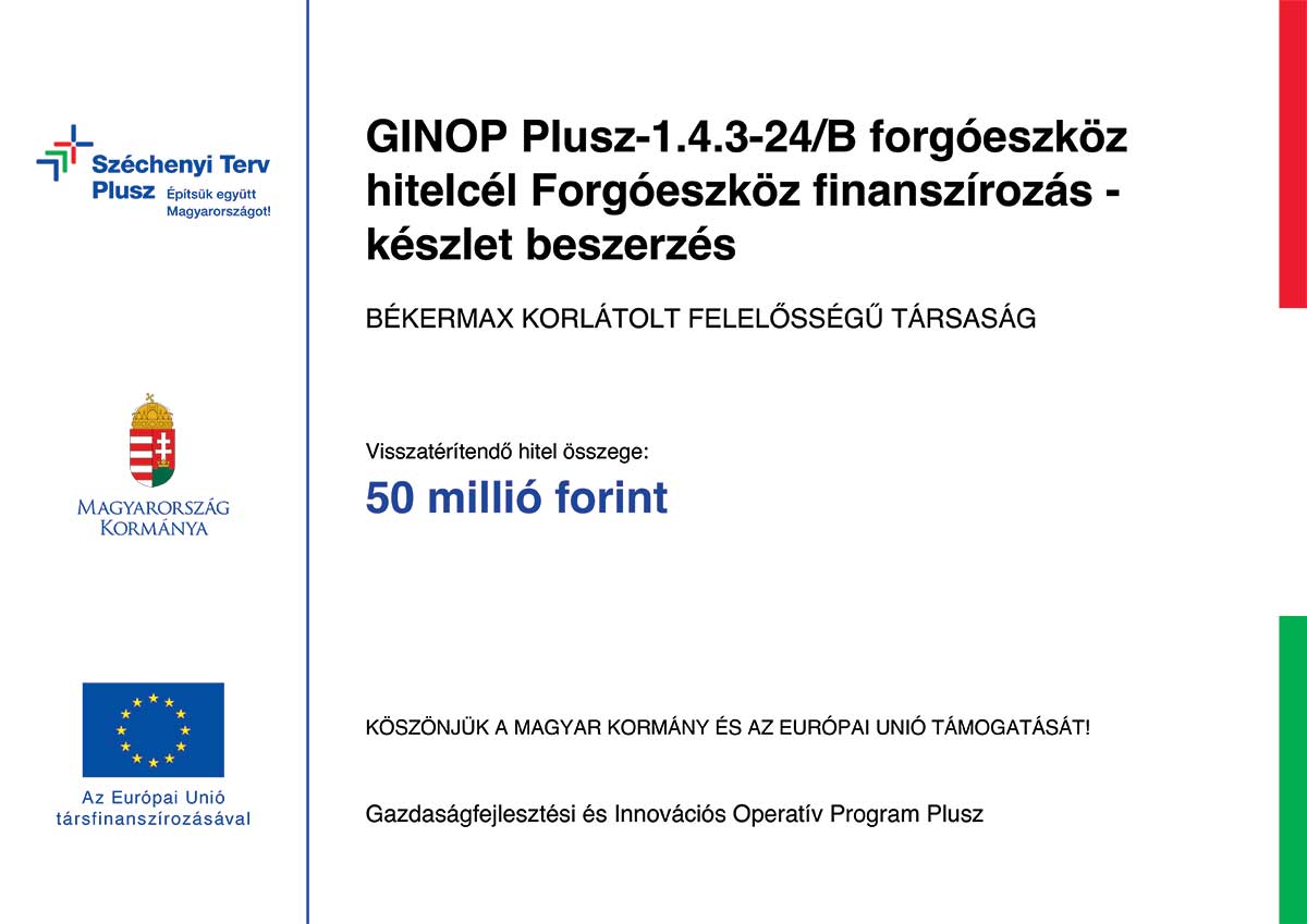 Békermax Kft. innovációs képességének fejlesztése A "BÉKERMAX" Gyártó, Kereskedelmi és Szolgáltató korlátolt Felelősségű Társaság 49 742 821 Ft összegű vissza nem térítendő támogatást nyert el a Gazdaságfejlesztési és Innovációs Operatív Program támogatási rendszeréhez „A mikro-, kis- és középvállalkozások modern üzleti és termelési kihívásokhoz való alkalmazkodását segítő fejlesztések támogatása a leghátrányosabb helyzetű régiókban” című Felhívásra benyújtott „Békermax Kft. innovációs képességének fejlesztése” című, GINOP_PLUSZ-2.1.3-24-2024-00242 számú támogatási kérelem keretében.